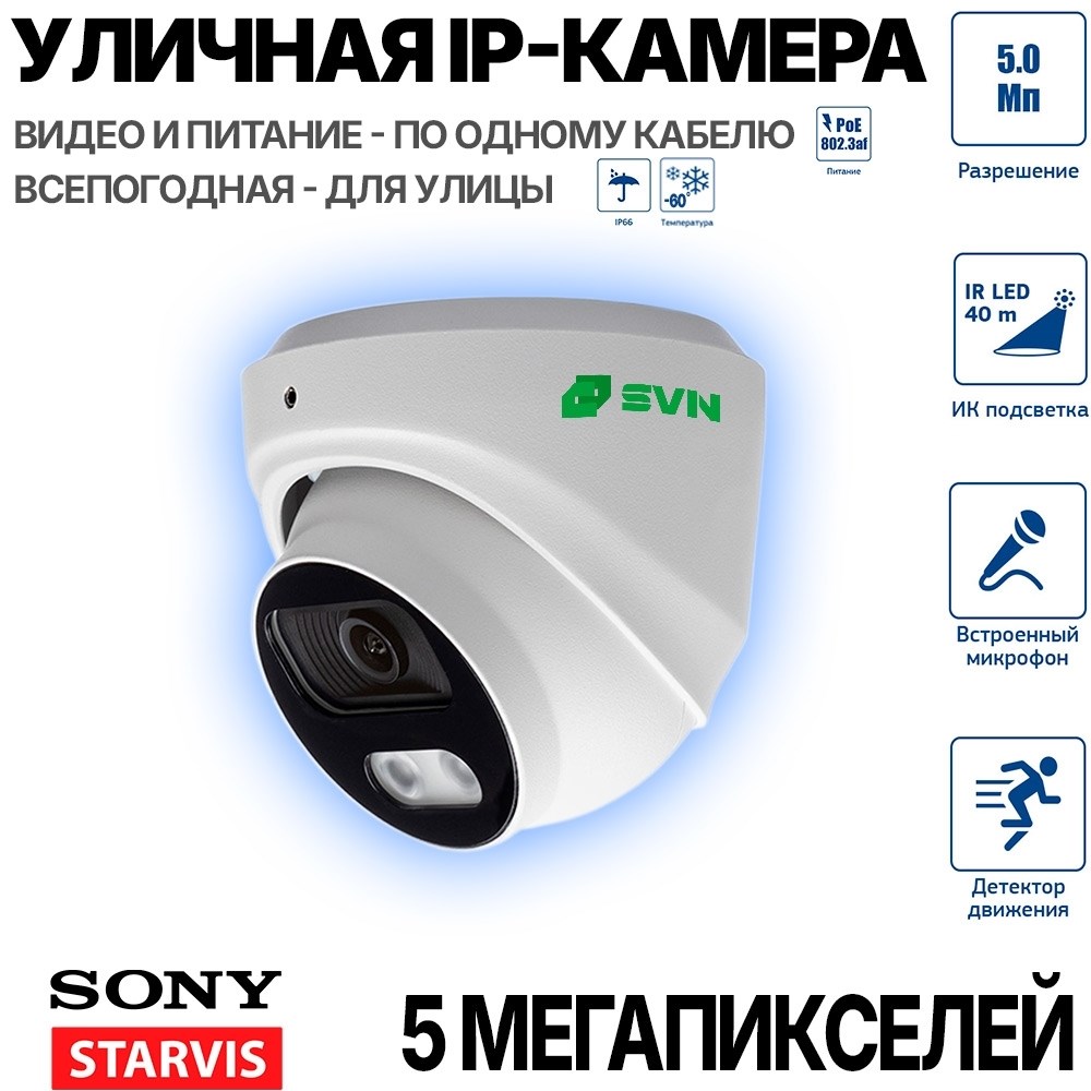IP-камера 5 Мп SONY, ИК+LED подсветка 40м, микрофон, POE