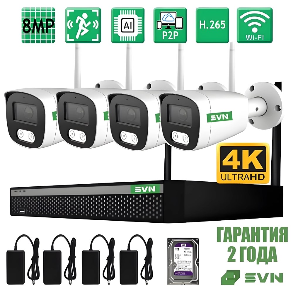 Комплект видеонаблюдения содержит WiFi камеры на 8Мп со встроенными микрофоном, гибридной подсветкой до 30м, регистратор рассчитан на 8 WiFi камер разрешением до 8Мп. Ёмкость жесткого диска покупатель может подобрать самостоятельно, используя соответствующую форму в начале страницы товара. Такой комплект может применяться для аудио и видео контроля магазинов, автомоек, дачи, частного дома и т.д. Качественная матрица на 8Мп обеспечивает глубокую детализацию картинки днем и ночью. Номинальная зона покрытия такого комплекта достигает радиуса 400м при идеальных условиях и отсутствии источников помех. В реальных условиях зона WiFi сигнала проходит до трех пеноблочных стен.